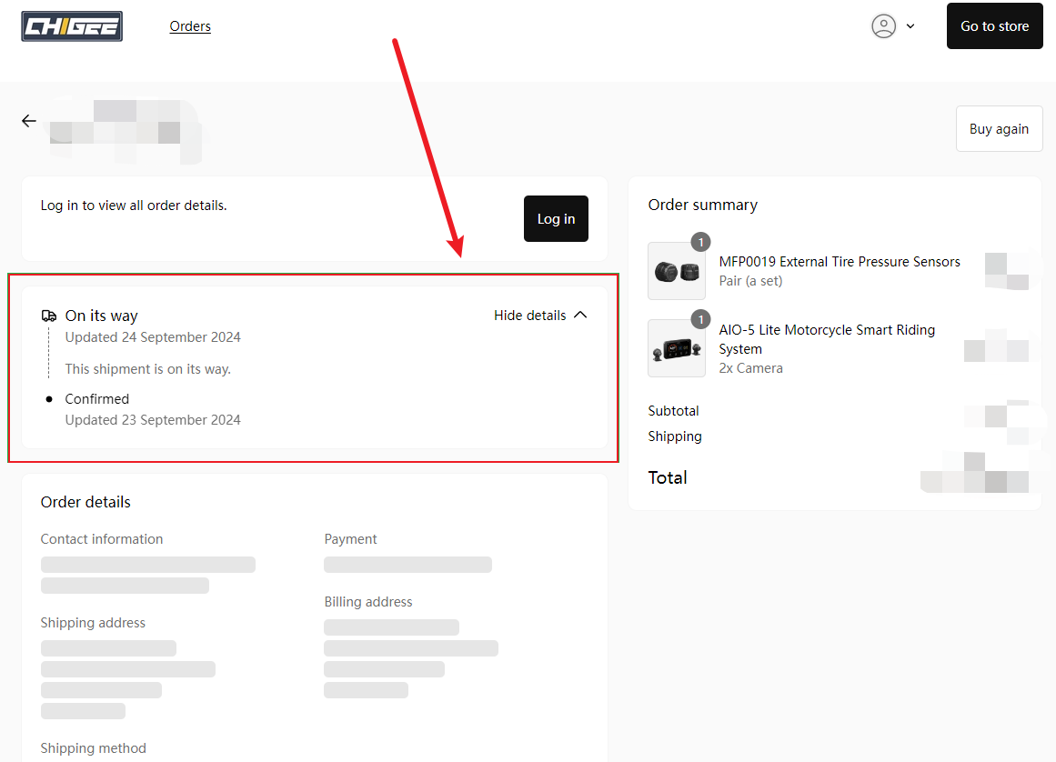 • Once logged in, you'll see your current order status